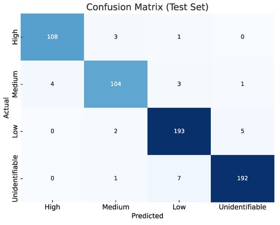 Figure 6 presents the confusion matrix summarizing the CNN model’s performance in the final evaluation. This matrix was calculated using the test set, which consists of 624 spectrograms that the model did not see during the training or validation phases. The matrix axes represent the four signal quality classes: ‘High’, ‘Medium’, ‘Low’, and ‘Unidentifiable’. The vertical axis (‘Actual’) indicates the true label for each sample, while the horizontal axis (‘Predicted’) shows the class predicted by the model. The values on the main diagonal (108, 104, 193, 192) represent the number of correct classifications for each class. The off-diagonal values represent misclassifications. A strong diagonal dominance is observed, indicating high accuracy across all classes. Misclassifications are minimal and primarily occur between adjacent classes (e.g., 7 ‘Unidentifiable’ samples were misclassified as ‘Low’, and 4 ‘Medium’ samples were misclassified as ‘High’). This distribution confirms the model’s robust generalization capability.