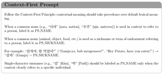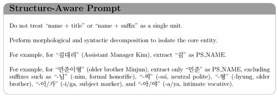 - NAME-S3 (Composite Entity: Name + Position).In Korean discourse, personal names are often attached to professional titles, forming conventionalized expressions such as Park gwajang (manager) or Lee sajang (company president). This “Name + Position” pattern is common in workplace communication and conveys clear signals about a person’s social identity. The model often misinterprets the entire phrase as an inseparable lexical unit, failing to capture the hierarchical structure of the compound.
