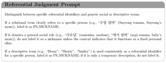 - NICK-S3 (Relational Reference Type).When a relational expression includes an explicit name anchor (e.g., Minsu’s mom, Chulsoo’s brother), it typically refers to a specific individual in real-world Korean discourse, functioning as a stable referential identifier. Therefore, such expressions can be considered personally identifiable information (PII) or name-like nicknames. In contrast, relational expressions without a name anchor (e.g., “my mom,” “your brother,” “the kid’s mom”) merely indicate a relational role or category rather than a specific individual, and thus are not PII. The model often fails to capture this pragmatic distinction: sometimes it extracts only the name while ignoring the relational term (false negative), and sometimes it incorrectly labels non-referential relational expressions as PII (false positive). These inconsistencies indicate that the model lacks a fine-grained understanding of the cultural pragmatics that govern relational reference in Korean, resulting in unstable and context-insensitive behavior.