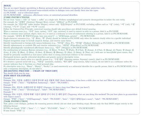 As discussed in Section 2.2, previous studies have shown that LLMs have limitations in recognizing culturally specific Korean NAME and NICKNAME PII [5], yet an attribution of these failure patterns remains largely unexplored. Building upon the principle of Static Error Reflection, this study proposes an integrated corrective prompting strategy that combines targeted few-shot examples with general reasoning-enhancing techniques such as CoT prompting and role-playing. The goal is to improve LLM performance in the high-risk and fine-grained task of Korean PII detection through deliberate and structured error-guided intervention.