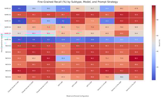 Building upon the diagnostic corpus constructed in the previous section, this study analyzes the errors made by the model in recognizing Korean personal names and nicknames. To extract interpretable patterns from seemingly scattered error instances, we adopt a bottom-up inductive analysis approach. This method does not predefine error types but allows patterns to naturally emerge from the data, thereby highlighting the model’s inherent vulnerabilities and reasoning biases in a data-driven manner. Compared with the previous study on English name recognition [6], this work employs a distinct analytical paradigm. While the prior study follows a top-down framework that evaluates model performance based on predefined error, our approach relies entirely on a data-driven inductive strategy, allowing error patterns to emerge directly from model predictions. This design minimizes the prior bias introduced by human-defined taxonomies and offers a more objective depiction of the model’s failures in recognizing Korean personal names and nicknames.