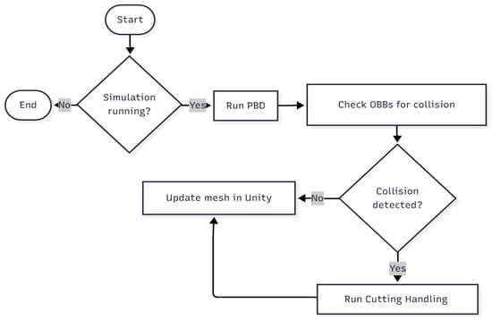Cutting simulation is an important research field focused on developing methods to accurately represent object disintegration under physical constraints. Cutting simulation can be used in many different scenarios, such as 3D modeling, animation, biomechanics, medicine, and education. Recently, virtual reality (VR)- and augmented reality (AR)-based surgical training simulators have gained significant attention due to their advantages over traditional education [1]. In [2], it was found that in the scope of laparoscopic surgery training, VR simulators provide realistic surgical scenarios and objective performance assessments, while AR simulators have the potential to combine haptic feedback with visual guidance overlays, enhancing the overall learning experience. In dental education, VR- and haptics-based simulators have become globally acknowledged as essential learning tools [3,4]. A study in [5] reported that virtual simulation enables immersive and interactive environments where students can practice procedures, receive instant feedback, and build confidence without risking patient safety. The authors in [6] discovered that VR/AR training in oral and maxillofacial surgery not only improves performance but also supports planning for complex procedures, such as facial transplantation, where precise donor–recipient matching is very important. The study in [7] analyzed how surgery simulators are applied in the field of orthopedics. It revealed that VR-based simulators are more cost-effective than cadaveric- and animal-based training, as they allow unlimited practice without the substantial maintenance costs associated with animal laboratories.