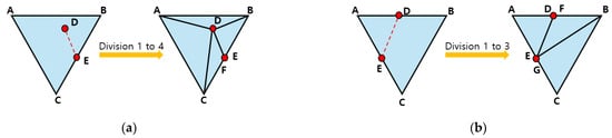 In this work, we use an element subdivision method to keep the cutting path as accurate as possible. When intersection checking step is finished for the current time step, all intersected triangles are subdivided in line 23 of Algorithm 1, depending on the intersection information. Figure 4 illustrates different subdivision patterns for a triangle ABC intersected by the cutting plane, according to number of intersected edges and intersection points. In Figure 4a, triangle ABC has one intersected edge BC and two intersection points: one on the edge BC and one inside the triangle’s interior. A 1-to-4 subdivision is performed by first connecting the intersection point D to the original vertices A, B, and C. The intersection point E is then duplicated as point F to fully subdivide edge BC. Then, E and F are connected to intersection point D. This produces four new triangles: ADB, ACD, DCF and DEB. Figure 4b demonstrates the 1-to-3a subdivision. Here, triangle ABC has two intersected edges, AB and AC, with intersection points D and E, respectively. New vertices F and G are created by duplicating D and E. One of the new vertices is then connected to one of the original vertices of triangle ABC, resulting in three new triangles: AED, FGB and GCB. In Figure 4c, a 1-to-2 subdivision is used. The cutting path intersects edge AB at point D and passes through the existing vertex C. New vertices F and E are generated by duplicating D and C, respectively. The triangle is then split into two new triangles: ACD and FEB. Figure 4d illustrates the 1-to-3b subdivision. Here, triangle ABC is intersected at the existing vertex C and at intersection point D. Only vertex C is duplicated to create a new vertex E. The intersection point D is then connected to vertices A, B, C and E, yielding three new triangles: ADB, ACD, DEB. In line 24, the intersected edges are divided into positive and negative lists depending on what side of the cutting plane they lie.