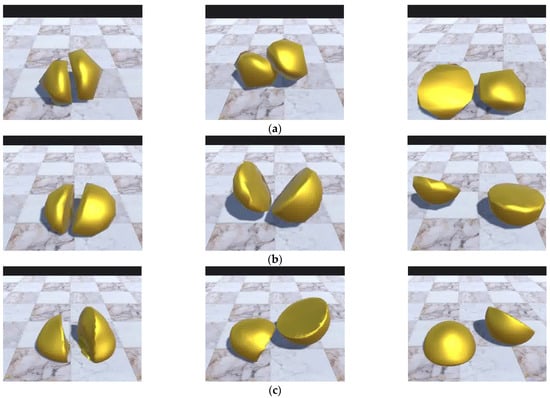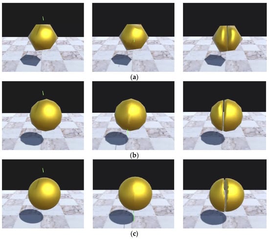 Cutting simulation: (a) Sphere 20: time step 0.005, iteration number 30; (b) Sphere 80: time step 0.005, iteration number 30; (c) Sphere 768: time step 0.005, iteration number 20.