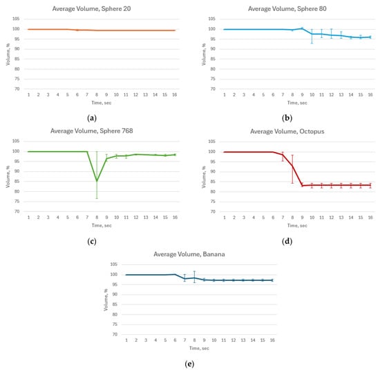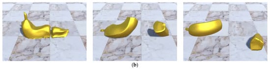 Figure 10 illustrates the average volume with error bars calculated during cutting simulation. The average volume rate was 99.6%, 98.5%, 98.0%, 91.1%, and 98.3% for Sphere 20, Sphere 80, Sphere 768, Octopus and Banana, respectively. As shown in Figure 10a,b,e, Sphere 20, Sphere 80 and Banana demonstrate negligible volume change throughout the simulation. In contrast, the Sphere 768 and Octopus models experience a significant volume drop when collided with the floor. However, Sphere 768 successfully recovered its original volume after the collision. In case of the Octopus model, the volume loss, despite not being very critical, stays on the same level.