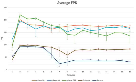Average FPS with error bars of the cutting simulation of Sphere 20, Sphere 80, Sphere 768, Octopus and Banana.