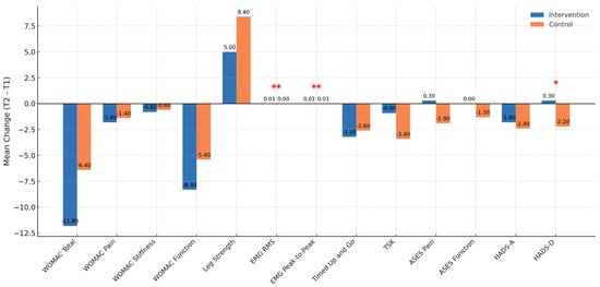 Between-group comparison of outcome changes. * indicates p < 0.05; ** indicates p < 0.01.