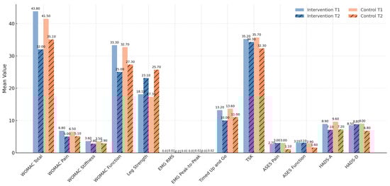 For WOMAC scores, both groups improved significantly in total, pain, stiffness, and function subscales. No statistically significant group × time interaction was found (p = 0.067). However, the intervention group demonstrated a numerically larger reduction in the function subscale (−8.3 vs. −5.4 points). Both groups exceeded the minimal clinically important improvement (MCII) [35] threshold for WOMAC (≈9–12 units), as defined by OMERACT–OARSI. Refs. [34,35] confirming that functional improvements were not only statistically but also clinically meaningful in both settings.