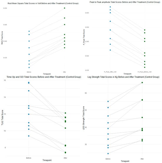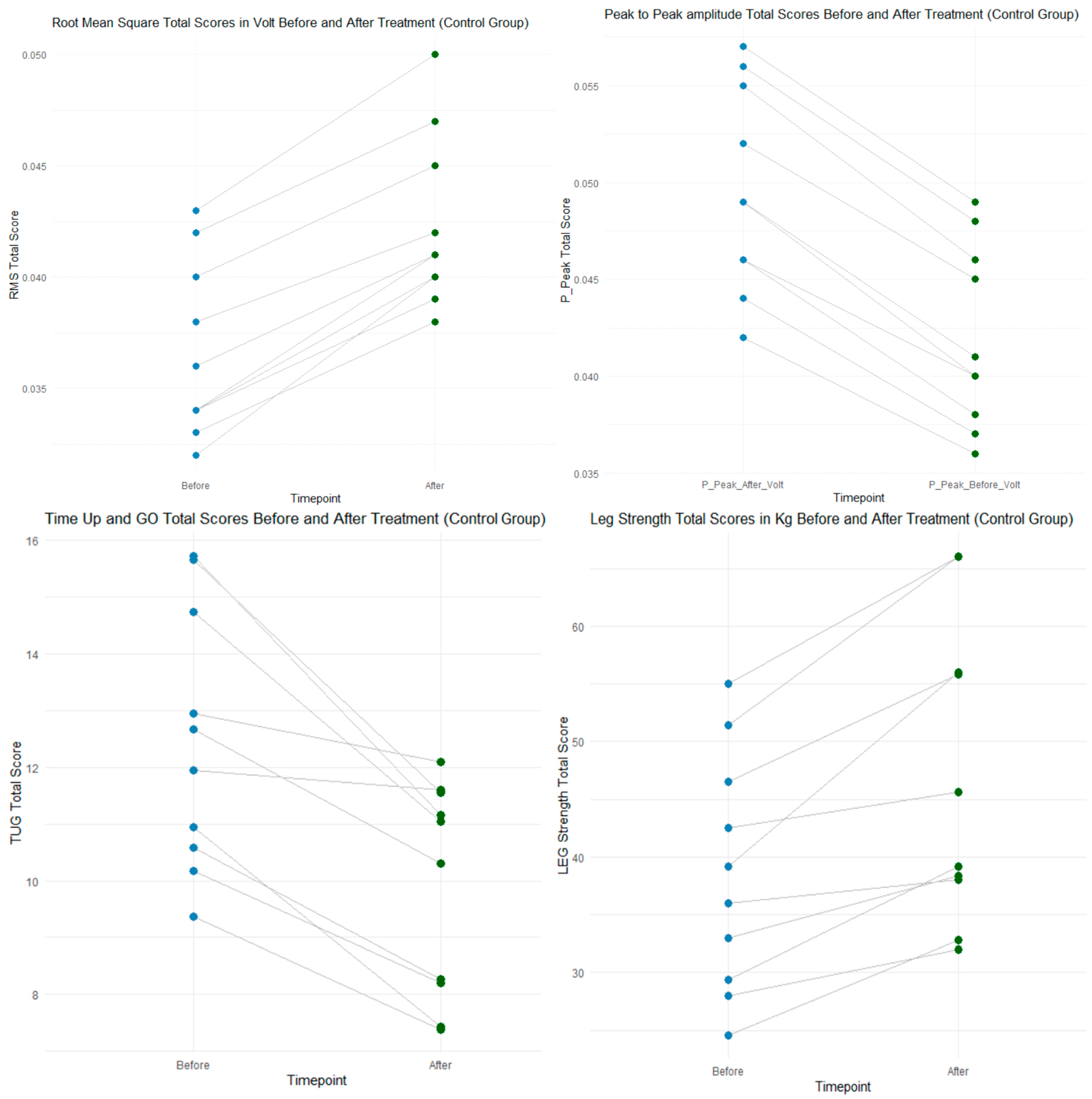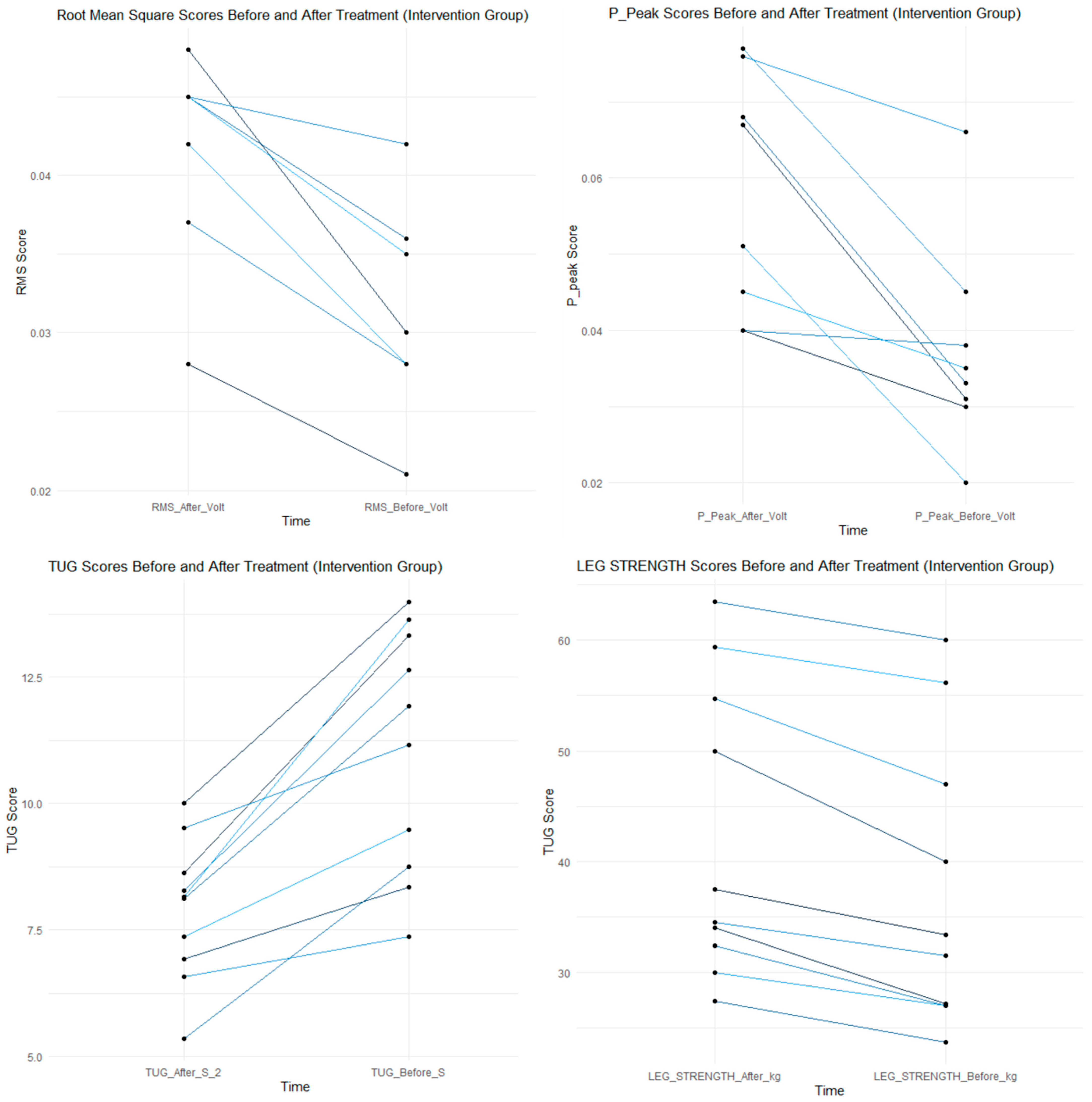 These plots illustrate the pre–post changes in Timed Up-and-Go performance, quadriceps strength, and EMG-derived RMS and peak-to-peak activation for the Control and Intervention groups.