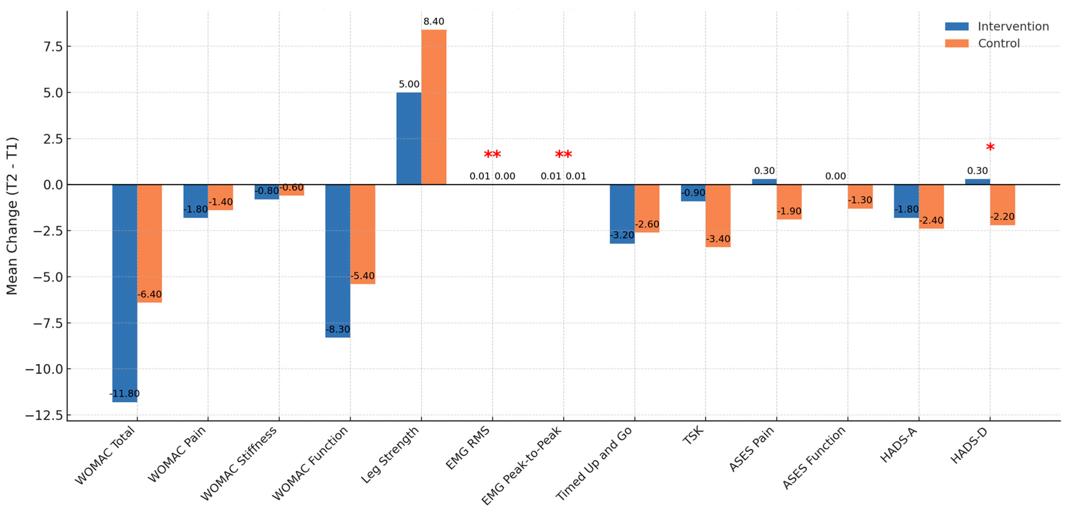 Summary of psychological outcomes (TSK, HADS, ASES): Comprehensive data for the psychological and self-efficacy measures are presented in Table 2 and Table 3. TSK scores decreased by 3.4 points in the Control group (p = 0.294) and 0.9 points in the Intervention group (p = 0.756), showing no statistically significant or clinically meaningful change (MCID ≈ 4 points). For HADS, the Control group demonstrated significant reductions in both Anxiety (−2.4 points, p = 0.022) and Depression (−2.2 points, p = 0.024), whereas the Intervention group showed non-significant changes (HADS-A = −1.8, p = 0.141; HADS-D = +0.3, p = 0.882). Regarding ASES, the Control group exhibited significant improvements in Pain (+1.92 points, p = 0.025) and Function (+1.24 points, p = 0.045), exceeding the MCID (~1 point) for arthritis self-efficacy, while the Intervention group showed no significant change. Full pre- and post-intervention means, 95% confidence intervals, p-values, and Cohen’s d effect sizes are detailed in Table 3 and Table 4.