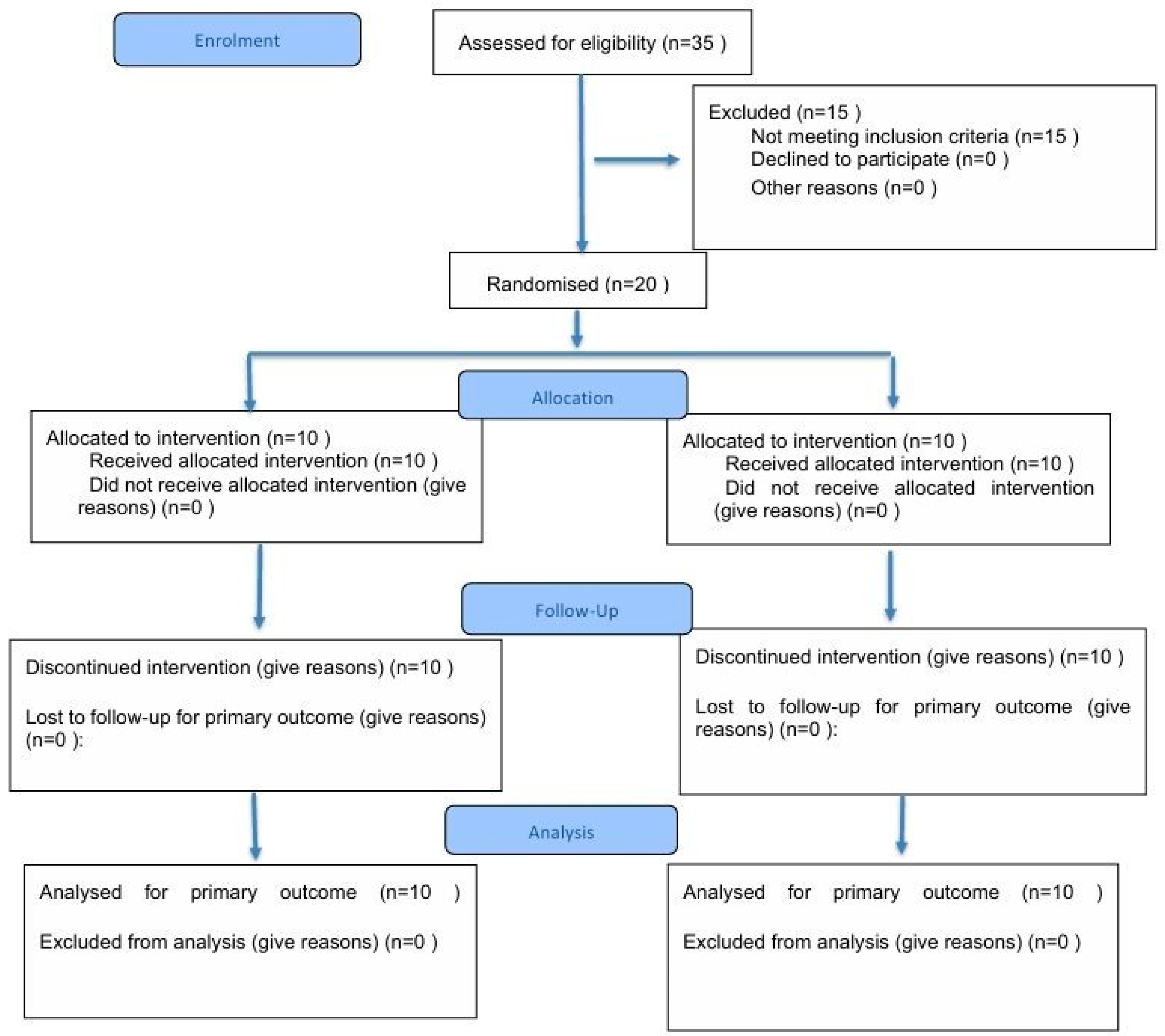 | Participant flow (with diagram) | 22a | CONSORT 2025 flow diagram (Assessed: 35, Randomized: 20, Allocated: 10/10, Analyzed: 10/10) | Page 33 |