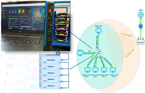 Figure 1 presents the physical layer configuration for the field-deployable Kubernetes cluster with 5 enabled nodes (1 head node and 4 working nodes). A custom designed case was constructed to house the PoE switch and worker nodes for ensuring fast deployment, portability, scalability and mobility in the field. For the initial deployment, the PoE switch was connected to the internet via Wi-Fi (using a router) to facilitate software installation and configuration. This connection was removed once the setup was complete, leaving the cluster to operate as an isolated, self-contained network.