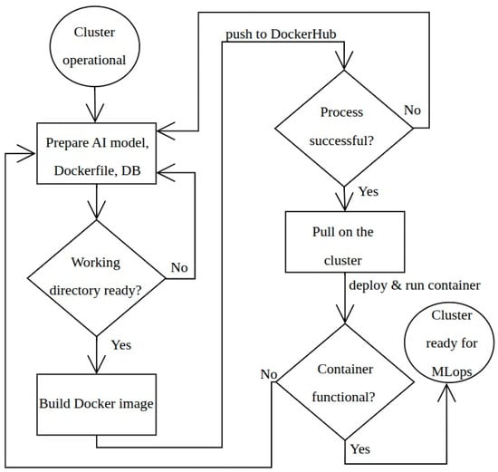 - Dockerization [28]—Used for containerizing ML models and application services, ensuring portability and reproducibility across heterogeneous computing environments. A developer creates a Dockerfile that specifies the environment, libraries, and code for their application. This Dockerfile is used to build a Docker image. Once the image is created, it is pushed to a Docker Hub repository. This centralized repository acts as a public or private registry for storing and sharing container images. Other users or the Kubernetes cluster can then pull this image from Docker Hub to run the application, ensuring consistency and portability across different environments. The diagram in Figure 2 presents the flow used to create, push, and run a Docker image. In the remote environment scenario considered in this manuscript, on-premises container registry will serve the function of Docker Hub to manage and distribute images within the isolated network. This built-in registry was selected because it requires minimal configuration, operates without external dependencies, and is suitable for field environments where connectivity is limited or unavailable. All images used in the ML and web-hosting scenarios were pushed to this internal container registry and distributed to worker nodes through MicroK8s’ native image-sync mechanisms. Although Harbor or other enterprise-grade registries (e.g., OCI-compliant registries integrated with CI/CD or GitOps workflows) offer more advanced features, these will be considered for future extensions of the platform. A simplified diagram for MLOps Docker pipeline for model deployment on cluster is presented in Figure 3.
