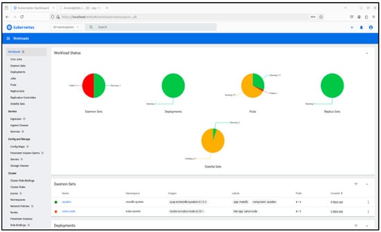 In MicroK8s, the Kubernetes Dashboard is enabled with microk8s enable dashboard, after which its status can be confirmed using microk8s status. Secure access requires an authentication token retrieved from the kubernetes-dashboard namespace. The interface can then be accessed in two ways: locally, by starting a proxy with microk8s kubectl proxy and navigating to the generated API URL in a browser, or cluster-wide, by modifying the dashboard service type from ClusterIP to NodePort, which exposes it on a dynamically assigned port (30,000–32,767) retrievable via kubectl. In both cases, authentication is completed using the generated token, with the browser displaying a warning for the self-signed certificate that must be acknowledged. Once operational, the Kubernetes Dashboard provides real-time insights into cluster workloads, node health, and resource utilization. Such a display for the proposed cluster is presented in Figure 6.