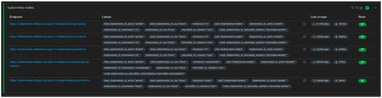 Access to Prometheus was established through kubectl port-forwarding, mapping the Prometheus pod to a local port (localhost:8080). This interface allowed for direct inspection of collected metrics, execution of PromQL queries, and visualization of time-series data such as CPU usage, memory consumption, and filesystem utilization. Prometheus also maintained a registry of all monitored targets, enabling administrators to validate the health and responsiveness of nodes and services. Figure 7 presents the implemented Prometheus targets monitoring the Kubernetes nodes.