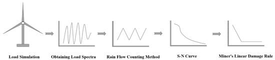 Fatigue damage assessment in wind turbine structures is fundamentally based on three key elements: the Rainflow Counting (RFC) method, the S–N fatigue life curve, and Miner’s linear cumulative damage rule. As illustrated in Figure 1, the RFC algorithm processes the simulated load time series by decomposing the complex, variable-amplitude load history into a series of discrete stress cycles. Using the material-dependent S–N curve, the fatigue damage associated with each cycle is quantified, and the total fatigue damage is subsequently obtained through Miner’s rule.