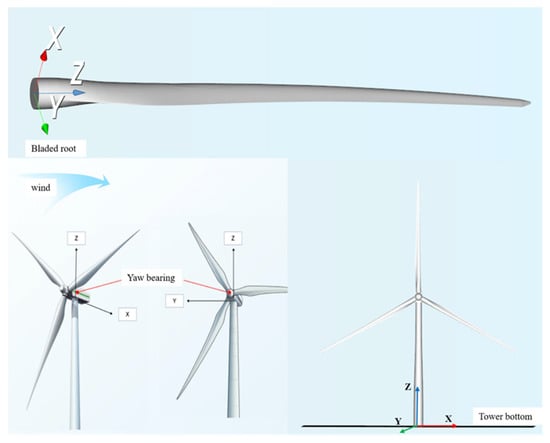 To comprehensively assess the impact of different wind conditions and yaw angles on the structural performance of wind turbines, as shown in Figure 2, the DELs at the blade root, tower base, and yaw bearing were selected as key indicators for analysis. The bending moment at the blade root is a critical factor affecting the structural performance of wind turbines, especially the bending moment perpendicular to the blade plane, which causes high-stress concentration at the blade root and may lead to fatigue failure. The centrifugal force generated by the rotation of the blades also increases the radial force at the blade root. The wind load, combined with the weight of the nacelle and tower, acts on the tower base, producing high bending moments and forces, with excessive bending moments potentially causing fatigue or instability in the tower base structure. The horizontal force at the yaw bearing not only causes friction and wear in the yaw system but also affects changes in yaw torque (bending moment around the Z-axis). Excessive yaw torque can lead to fatigue damage of the yaw bearing, thereby affecting the yaw capability and operational stability of the wind turbine. Considering the combined effects of these factors to more accurately predict the fatigue life of wind turbines, this study extracted the DELs of 10 load components of three key components of the wind turbine as representatives. These load components include: radial force at the blade root (BrFZ), bending moments around the X and Y axes at the blade root (BrMX and BrMY), horizontal forces at the tower base (TbFX and TbFY), bending moments around the X and Y axes at the tower base (TbMX and TbMY), horizontal forces at the yaw bearing (YbFX and YbFY), and yaw torque (YbMZ).