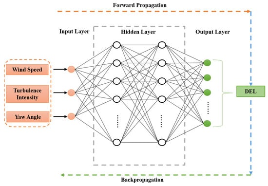 In this study, wind speed, turbulence intensity, and yaw angle were used as input variables, while the DELs at the blade root, tower base, and yaw bearing were used as output variables to construct the dataset for training the neural network. In neural networks, the processing of the dataset is crucial, as appropriately processed data can enhance the training efficiency, stability, and generalization ability of the network model. Therefore, this paper first performed a logarithmic transformation on the dataset. This step helps stabilize the variance and transform the data into a form that more closely follows a normal distribution, thereby improving the model’s convergence speed and prediction accuracy. Subsequently, the dataset was further divided into a training set (accounting for 80%) and a testing set (accounting for 20%). This division ratio aims to ensure that the model has sufficient data for learning during the training process while reserving a portion of the data to evaluate the model’s generalization ability.