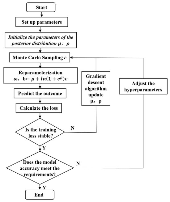 Construct the Bayesian Neural Network using Equation (4) as the loss function. The complete training process of the BNN is shown in Figure 4. First, set the initial values of the hyperparameters, including the number of hidden layers, the number of neurons, batch size, sampling times, noise value, learning rate, and training epochs. In the BNN, the activation function chosen is PReLU. Compared to other activation functions, PReLU not only has extremely high computational efficiency but also maintains a constant gradient in both positive and negative intervals, which helps to alleviate the problem of vanishing gradients. The optimizer selected is the Adam algorithm. The Adam optimizer is a widely used intelligent optimization method in deep learning. This algorithm can significantly improve the convergence speed and stability of model training. It can also automatically adjust the learning rates of different parameters based on their historical gradient information, allowing each parameter to have a differentiated update step size. The posterior distribution parameters and are initialized to 0 and −5, respectively. This makes the distribution approximately degenerate to deterministic values, ensuring that the initial weights and biases are concentrated around the mean, thereby enhancing model stability and reducing fluctuations in the early stages of network training. After reparameterizing the weights and biases , the differences between the output values and the label values, as well as between the prior and posterior distributions, are calculated based on the loss function. Finally, the gradients of each layer are computed through backpropagation according to the loss, thereby updating the distributions of the weights and biases . The network is optimized by adjusting the hyperparameters to achieve the best training effect, and the final hyperparameter settings are shown in Table 3 Hyperparameter Settings for Bayesian Neural Networks.