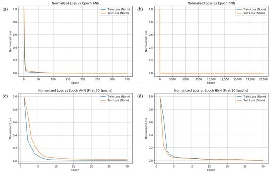 Training and validation loss curves of ANN and BNN models (a) ANN (full); (b) BNN (full); (c) ANN (first 30 epochs); (d) BNN (first 30 epochs).