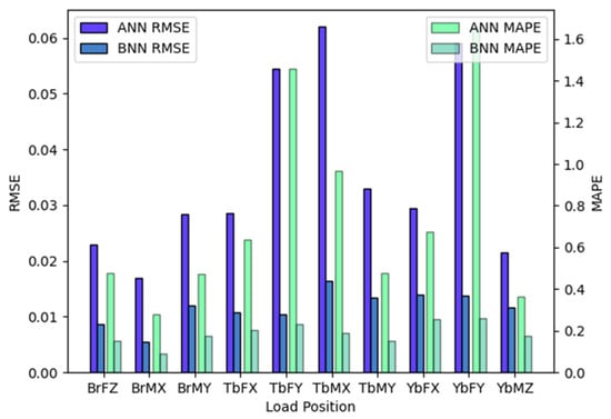 Despite the overall superior performance of the BNN, both models exhibit relatively higher errors at the BrMX, TbFY, TbMX, and YbFY positions. These locations are typically subject to turbulence-induced fluctuations and strong coupling between aerodynamic and structural responses. The current input feature set—wind speed, turbulence intensity, and yaw angle—may not fully capture the dynamic factors influencing these loads. Incorporating additional descriptors, such as shear gradients, tower shadow effects, or yaw misalignment dynamics, could further improve predictive performance at these positions, though it would also increase model complexity and data requirements.
