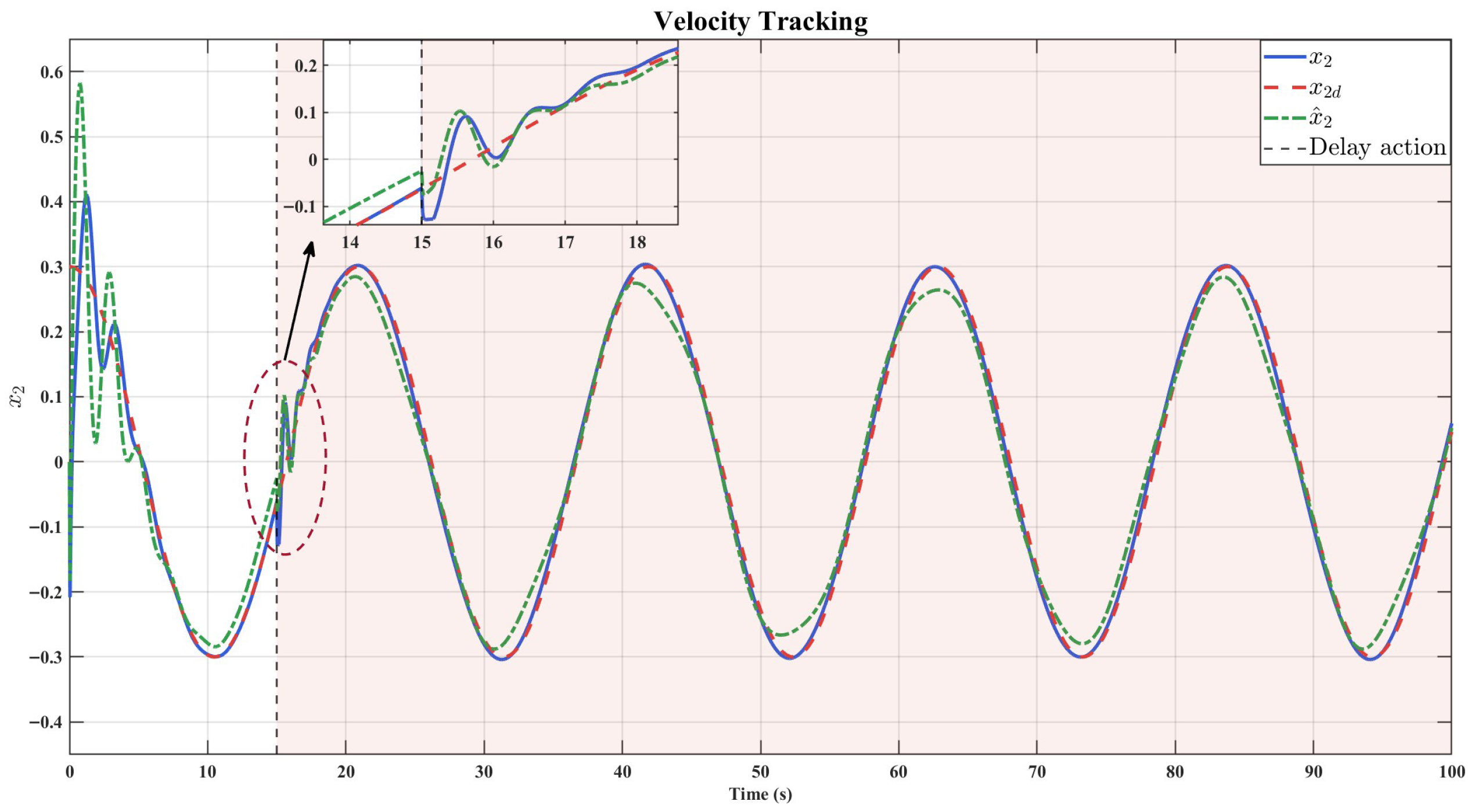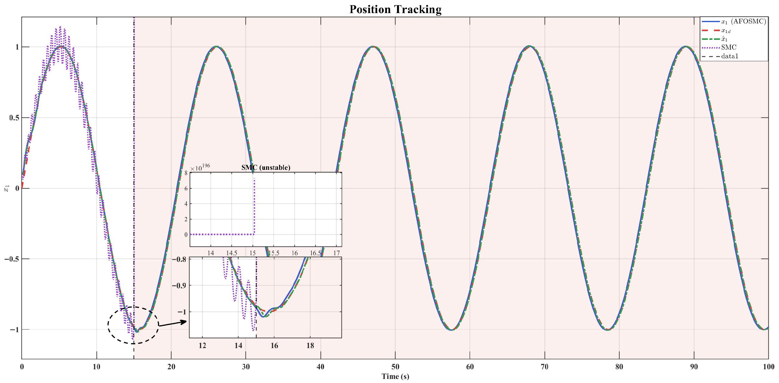 - A sliding-mode controller is developed using observer-estimated states, where the sliding surface incorporates delay-resilient terms and the switching gain is adapted online. The design builds on model–reference SMC principles and adaptive twisting ideas [27,28], ensuring robustness against matched uncertainties and bounded delay-induced disturbances.