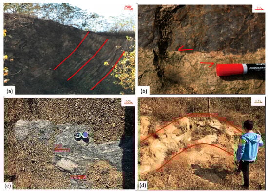 Abundant and clear kinematic indicators within the shear zone consistently point to left-lateral shear movement, suggesting a stable, singular kinematic history for the shear zone [20,21]. These indicators include outcrop-scale, asymmetric porphyroclasts and mica fish (Figure 2b), asymmetric Z-type folds (Figure 2d), and localized S-C fabrics. All these features reflect the relative displacement direction of material during shearing, providing reliable macroscopic evidence for left-lateral strike-slip.