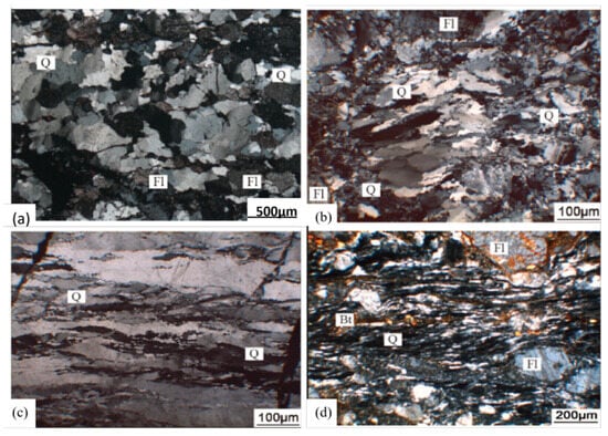 The deformation behavior of quartz provides crucial constraints on the deformation temperature. Quartz universally experienced intense dynamic recrystallization. On the one hand, fully recrystallized quartz and feldspar aggregates exhibit a foam-like texture, characterized by straight grain boundaries and ~120° triple junctions (Figure 3a). This microstructure is indicative of high-temperature grain boundary migration (GBM), constraining the deformation temperature to >550 °C [23]. On the other hand, intense plastic deformation led to the formation of elongated quartz ribbons (Figure 3c), providing further evidence for high-temperature ductile flow.