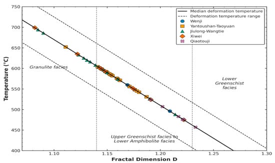 To ensure research transparency and data reproducibility, detailed quantitative results for all samples, including fractal dimension (D), linear regression correlation coefficient R, number of grains (N), and calculated temperature, for the Qiaotouji, Jiulong-Wangtie, and Xiwei areas are presented in Table 2, Table 3 and Table 4, respectively. Detailed data for all samples from the Wenji and Yantoushan-Taoyuan areas can be found in Supplementary Tables S1 and S2.