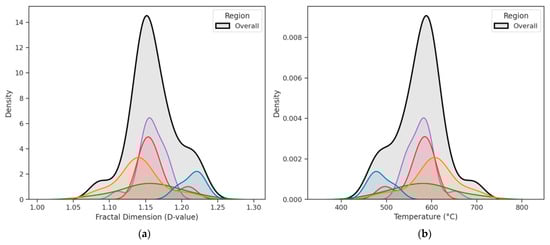 To more intuitively illustrate the deformation temperature distribution characteristics and variations across different regions and the entire Feidong segment, we plotted the probability density distribution of D-values and inverted temperatures for all samples (Figure 5). Significant differences in temperature distribution patterns were observed across regions: the Qiaotouji area’s temperatures primarily concentrated in the relatively lower temperature range of 450–525 °C, while areas like Jiulong-Wangtie and Xiwei not only showed clear peaks in the 550–630 °C range but also contained high-temperature samples extending to nearly 700 °C, vividly revealing the thermal heterogeneity within the shear zone.