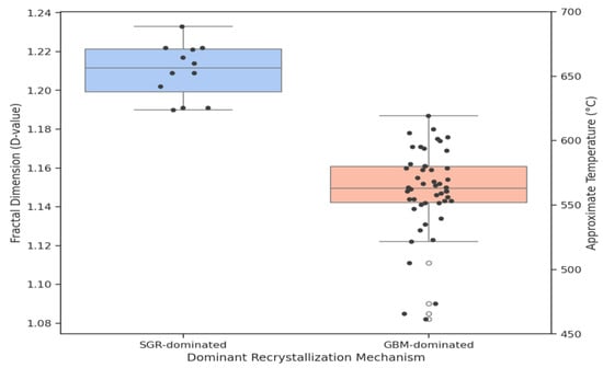 These quantitative temperature results show good consistency with microstructural observations. As shown in Figure 6, samples were divided into two groups based on whether the deformation temperature was above 530 °C (typical temperature where GBM mechanisms begin to dominate). It can be observed that samples dominated by grain boundary migration recrystallization (GBM) systematically corresponded to lower D-values (i.e., higher temperatures), while samples dominated by subgrain rotation recrystallization (SGR) corresponded to higher D-values. This clear correlation provides strong microstructural support for the applicability of the D-value thermometer in this study area.