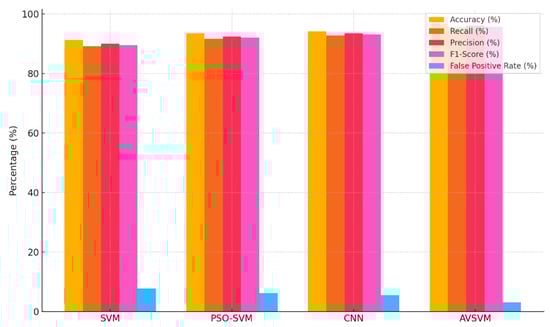 Figure 4 presents a comparative analysis of the detection performance of four models—SVM, PSO-SVM, CNN, and the proposed AVSVM—on the UNSW-NB15 dataset. Each group of bars illustrates the respective values of five evaluation metrics: accuracy, recall, precision, F1-score, and false positive rate (FPR). As shown, AVSVM consistently outperforms the baseline models across all key performance indicators. Its accuracy of 96.7% and recall of 95.4% indicate that it successfully detects the vast majority of malicious traffic while maintaining general correctness. The precision of 96.1% confirms that most of its positive predictions are accurate, and its F1-score of 95.75% reflects a well-balanced trade-off between recall and precision. Most notably, AVSVM achieves the lowest false positive rate (3.1%), a critical factor in reducing unnecessary disruptions in benign traffic.