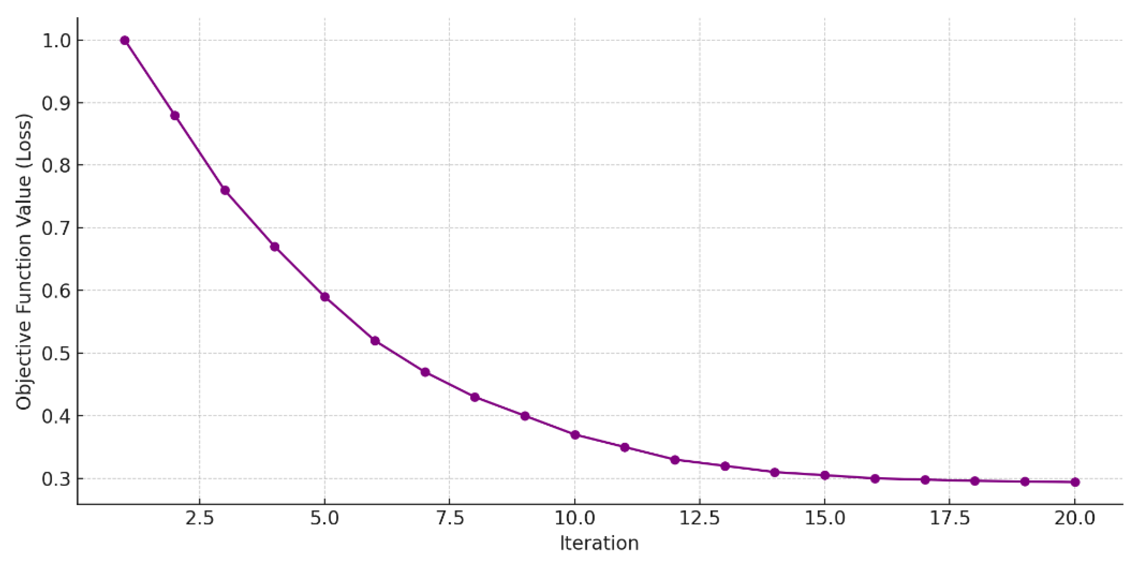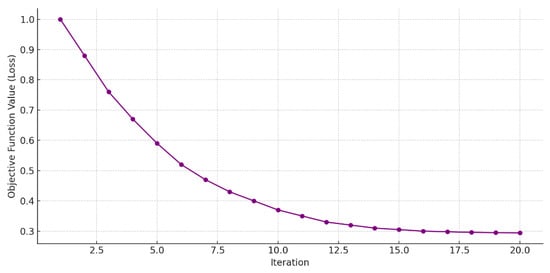 Figure 8 illustrates the convergence behavior of the Adaptive Volcano SVM (AVSVM) across 20 training iterations. The Y-axis represents the value of the objective (loss) function—such as the dual SVM margin loss or overall classification error—while the X-axis denotes the iteration number. As observed, the loss function exhibits a smooth and steady decline, indicating that the model converges efficiently toward a stable solution. The most significant improvements occur in the early iterations (1–10), where the eruption mechanism aggressively explores the margin space to escape suboptimal boundaries. From iteration 11 onward, the cooling schedule gradually reduces the perturbation intensity, leading to finer adjustments and stabilization of the margin. By iteration 20, the loss function has nearly plateaued, confirming the model’s convergence to an optimal or near-optimal decision boundary. This figure validates that AVSVM’s biologically inspired dynamics—pressure estimation, eruption, lava flow, and cooling—contribute not only to improved classification performance but also to reliable and stable training convergence.