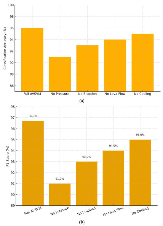 Ablation study of AVSVM components. (a) Classification accuracy of the full model compared to reduced versions with individual components removed (Pressure, Eruption, Lava Flow, Cooling). (b) Corresponding F1-scores under the same ablation conditions, illustrating the relative contribution of each mechanism to overall performance.