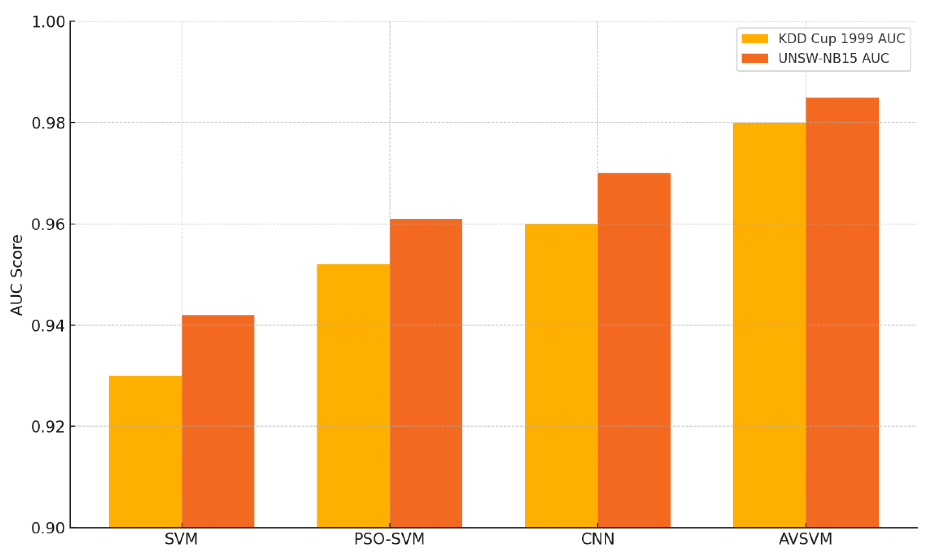 Figure 5 illustrates the Area Under the ROC Curve (AUC) values for the four evaluated models—SVM, PSO-SVM, CNN, and AVSVM—on both the KDD Cup 1999 and UNSW-NB15 datasets. The AUC metric is critical for evaluating a classifier’s ability to distinguish between attack and normal traffic across all possible classification thresholds. On both datasets, the proposed AVSVM model achieves the highest AUC scores, reaching 0.985 on UNSW-NB15 and 0.980 on KDD, indicating excellent discriminative power. These results suggest that AVSVM maintains a strong ability to differentiate between benign and malicious instances even under varying data distributions and class overlaps. Compared to the traditional SVM and optimization-enhanced models like PSO-SVM, AVSVM demonstrates consistent and significant improvements, further validating its adaptability and robustness in real-world malware detection environments.
