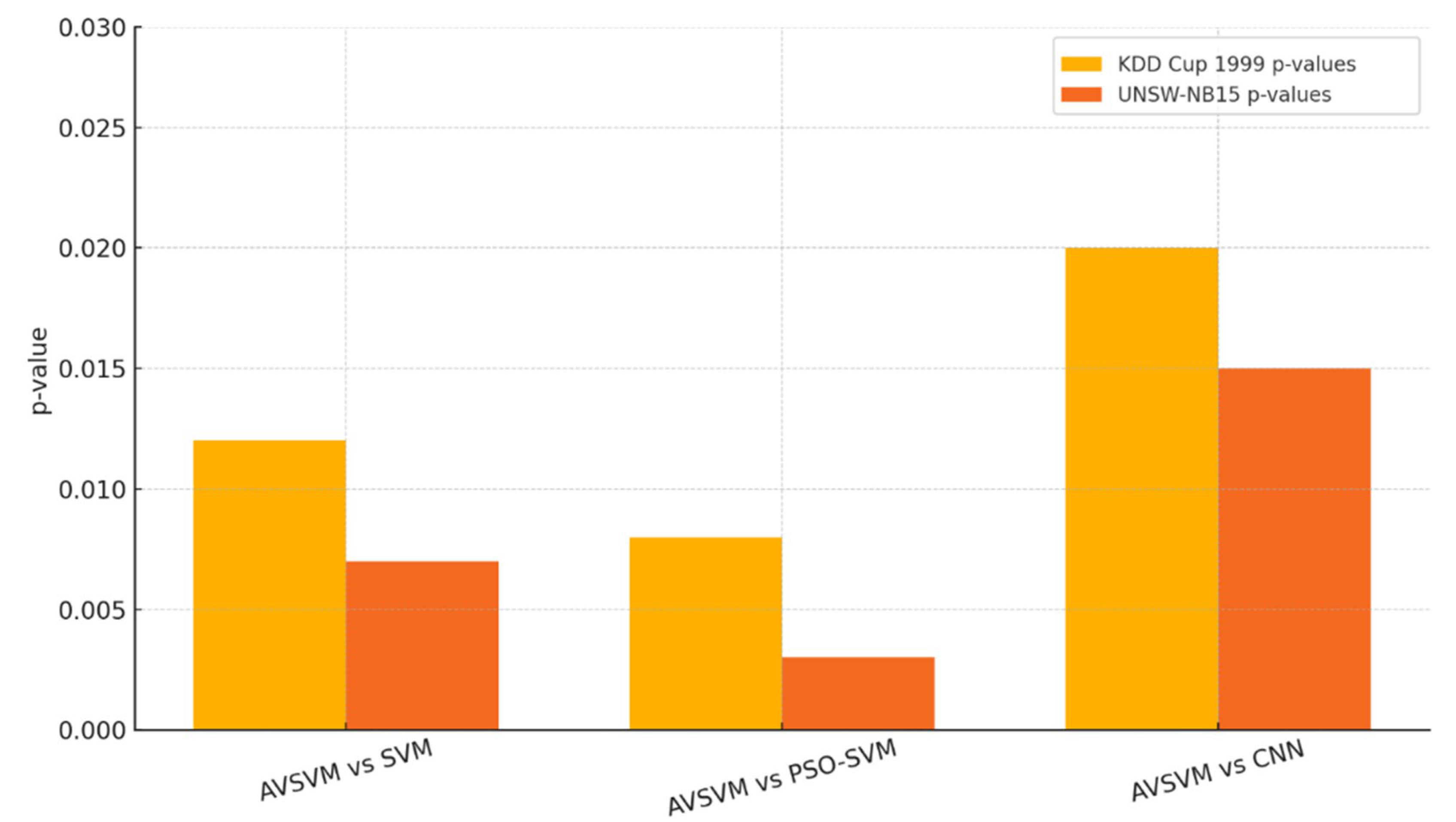 Figure 6 presents the results of a statistical significance analysis comparing the proposed AVSVM model against three baseline classifiers—SVM, PSO-SVM, and CNN—on both the KDD Cup 1999 and UNSW-NB15 datasets. The bars represent the