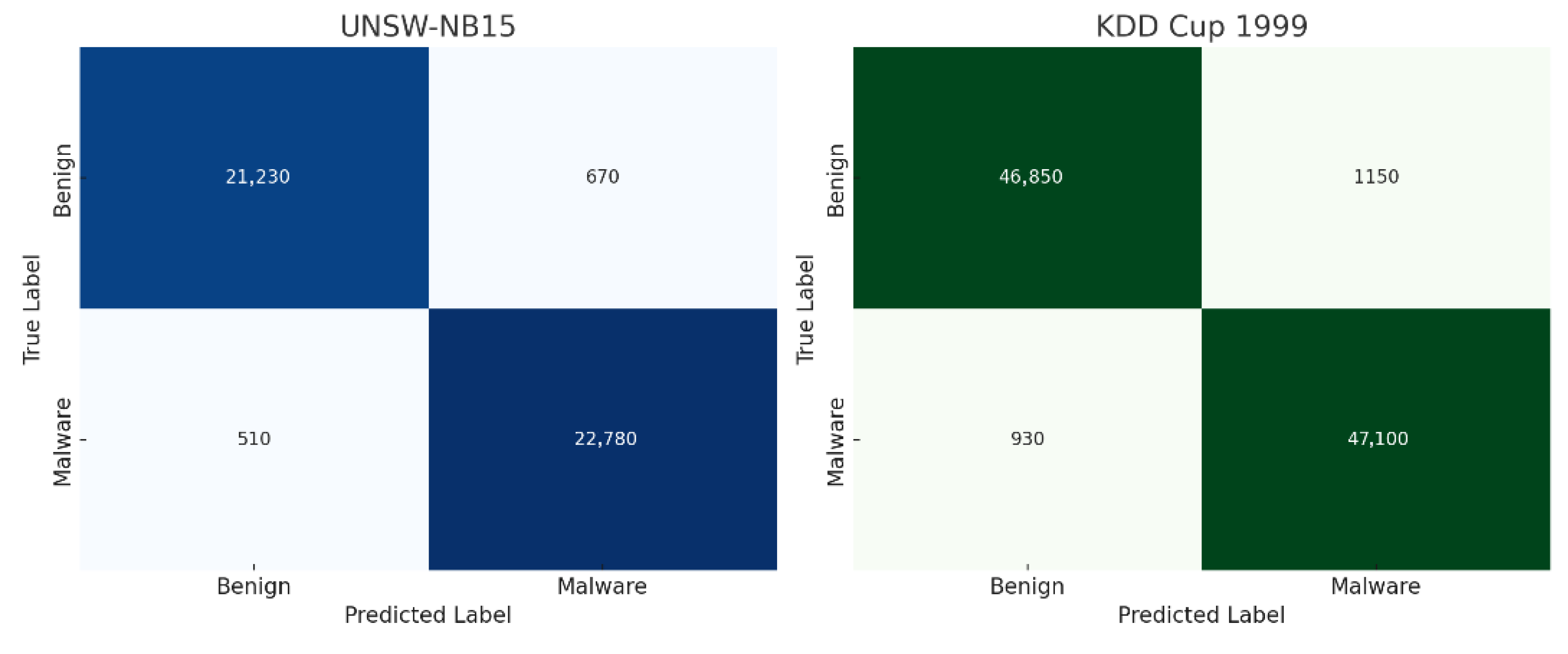 Figure 7 displays the confusion matrices of the proposed Adaptive Volcano SVM (AVSVM) model evaluated on the UNSW-NB15 and KDD Cup 1999 datasets. Each matrix shows the counts of true positives (TP), true negatives (TN), false positives (FP), and false negatives (FN), offering a detailed view of the model’s classification behavior. For UNSW-NB15, the model correctly classified 21,230 benign samples (TN) and 22,780 malware instances (TP), while misclassifying 670 benign samples as malware (FP) and 510 malware samples as benign (FN). This demonstrates a high sensitivity and specificity with minimal misclassification. For KDD Cup 1999, AVSVM correctly labeled 46,850 benign samples and 47,100 attack instances, with 1150 false positives and only 930 false negatives. These results further reinforce AVSVM’s reliability and effectiveness across datasets with different feature characteristics and threat profiles.