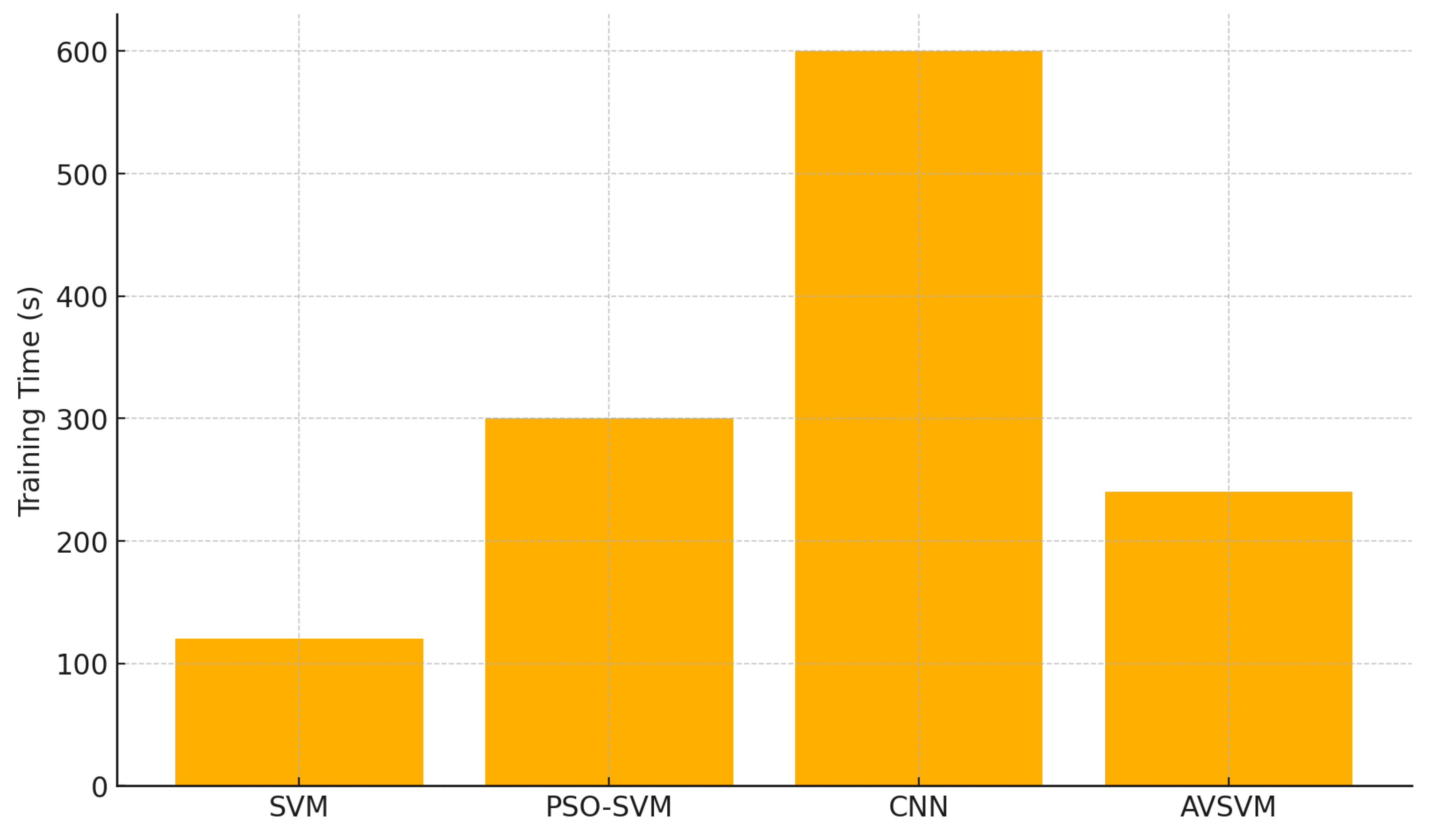 Figure 9 compares the wall-clock training times (in seconds) required by four classifiers—standard SVM, PSO-SVM, CNN, and the proposed AVSVM—on the same malware detection dataset under identical hardware conditions. The standard SVM achieves the fastest training, completing in just two minutes (120 s) due to its direct quadratic optimization and absence of iterative metaheuristic loops. By contrast, PSO-SVM requires roughly five minutes (300 s) because it embeds the particle swarm optimizer’s global search around each SVM fit, introducing substantial overhead. Training the CNN baseline proves the most time-consuming, at ten minutes (600 s), owing to its deep architecture, backpropagation across multiple layers, and large batch operations on high-dimensional feature inputs. The AVSVM model, which incorporates biologically inspired pressure monitoring, eruption perturbations, lava flow adjustments, and a cooling schedule, takes four minutes (240 s). While this represents an increase over the standard SVM, it remains markedly more efficient than PSO-SVM and far faster than the CNN.