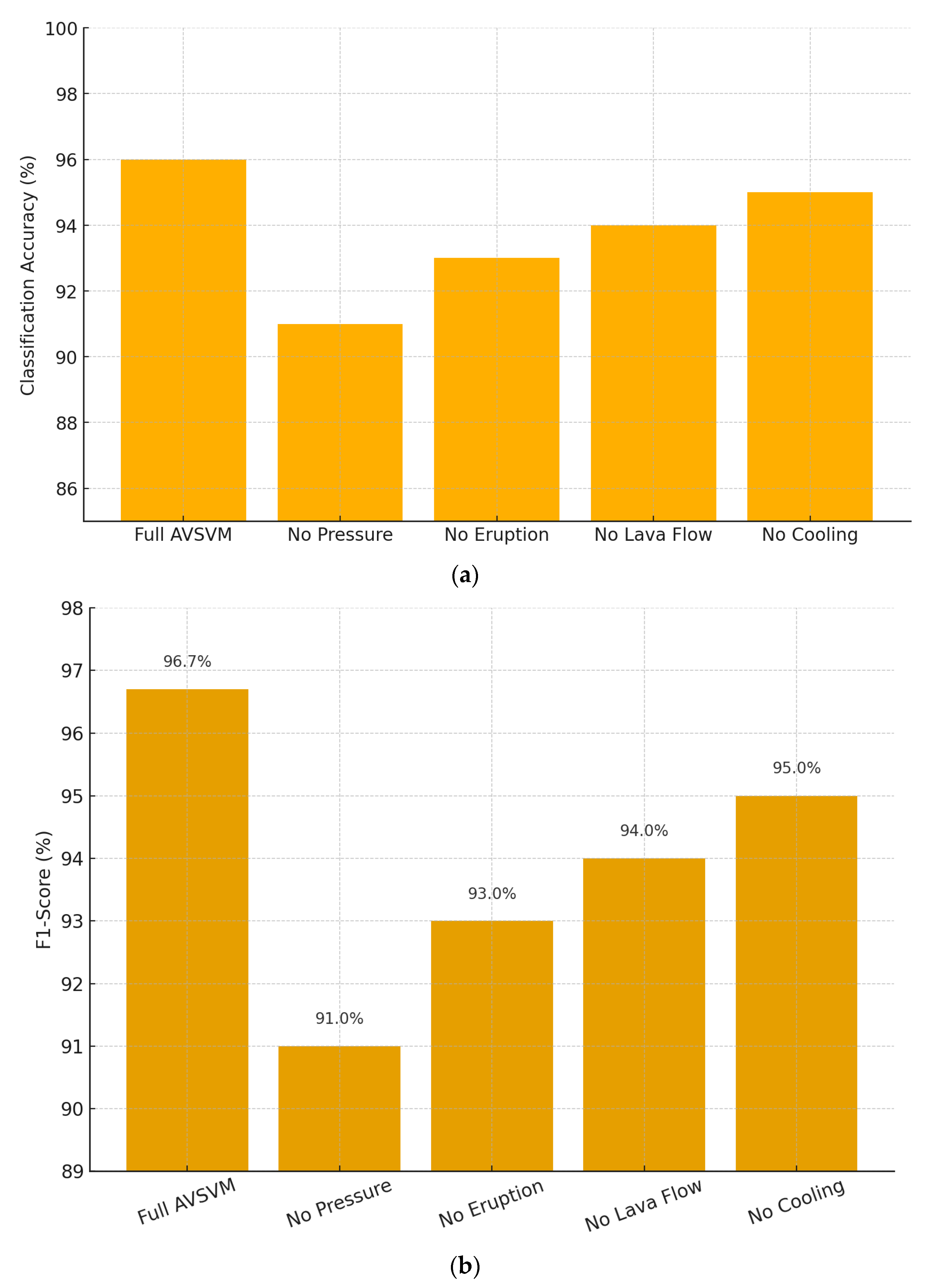 Removing the pressure function yields the largest performance drop, with accuracy falling from 96% down to 91%. This indicates that monitoring and acting upon the “pressure” of support vectors during training is critical to AVSVM’s ability to correctly classify malware samples. Without this component, the model loses much of its adaptive capacity, resulting in misclassification of boundary instances. Disabling the eruption operator reduces accuracy to 93%. The eruption step introduces strategic perturbations that help the classifier escape local minima in the decision boundary; without it, the algorithm still benefits from lava flow adjustments and cooling, but its exploration is less effective. Omitting the lava flow mechanism (accuracy: 94%) shows a smaller but still noticeable impact. Lava flow refines near-boundary samples by nudging them toward their class centers, sharpening the decision boundary. Its absence slightly degrades classification by leaving more ambiguous instances near the margin. Finally, skipping the cooling schedule yields a marginal drop to 95% as shown in