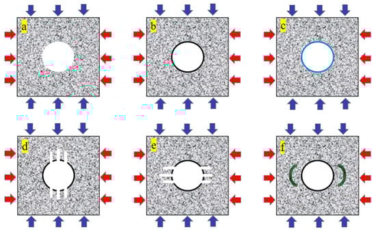 Schematic diagrams of different support modes of shaft. (a) non-support scheme; (b) non-fiber concrete scheme; (c) steel fiber concrete support scheme; (d) borehole pressure relief support along the direction of maximum principal stress; (e) borehole pressure relief support perpendicular the direction of maximum principal stress; (f) cutting groove destressing support scheme. The red arrows denote the maximum principal stress applied to the specimen, and the blue arrows signify the minimum principal stress.