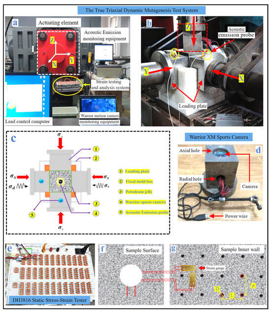Test studies were conducted on standardized samples using a true triaxial dynamic mutagenesis test system, with acoustic emission system, built-in camera, and static stress–strain gauge equipment to monitor the test process. Among them, the True Triaxial (TRW-3000) testing machine (Changchun Chaoyang Test Instruments Co., Ldt., Changchun City, China) comprises a computer, a hydraulic control system, and actuator components. There were independent load systems in the X, Y, and Z directions, with a maximum load of 2000 kN. At the same time, there were independent disturbance systems in the three directions, as shown in Figure 4a.