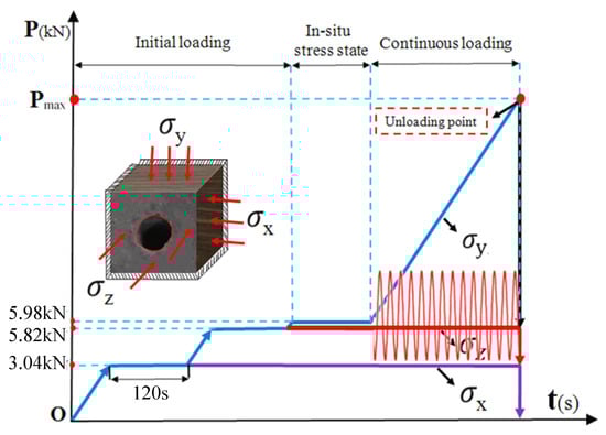 (3) After the stress distribution was balanced, loads were applied in the Y and Z directions to the vertical stress level. Keep the stress state for 120 s until the stress distribution is balanced, maintain constant X and Z stresses, and apply loads in the Y-axis direction to the maximum principal stress level, maintaining the stress state for 120 s. Then, apply a load in the Y-axis direction at a rate of 100 N/s until shaft failure.