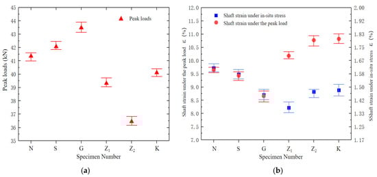 Upon reaching the target stress state on all three axes (X, Y, Z) of the true triaxial testing system, the loads in the minimum principal stress (X-axis) and vertical stress (Z-axis) directions were maintained constant. Meanwhile, the maximum principal stress (Y-axis) was continuously loaded at a rate of 100 N/s. The test results for shaft strain, peak load, and strain under the in situ stress condition are summarized in Table 3. The sample designations were as follows: N for the unsupported control samples; S for the control sample with ordinary concrete support; G for the sample with steel fiber-reinforced concrete support; Z2 for borehole pressure relief support, with drilling oriented along the maximum principal stress direction; Z1 for borehole pressure relief support, with drilling perpendicular to the maximum principal stress direction; and K for the sample with cutting groove destressing support.