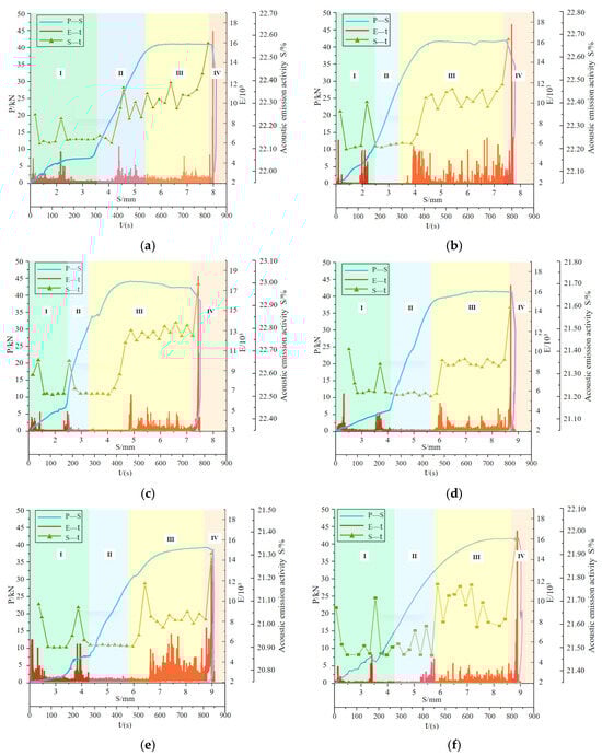 Upon calculating the acoustic emission activity S-value, 30 temporally distributed feature points were extracted. An acoustic emission activity–time (S-t) curve was plotted and integrated with the energy–time (E-t) diagram and the load–displacement (P-S) curve. These three sets of data were collectively visualized in a combined plot. Based on the characteristic trends of the curves, the sample failure process was divided into four distinct stages: the compacting stage, the elastic stage, the deformation stage, and the failure stage. Each stage was visually distinguished using differently colored backgrounds.