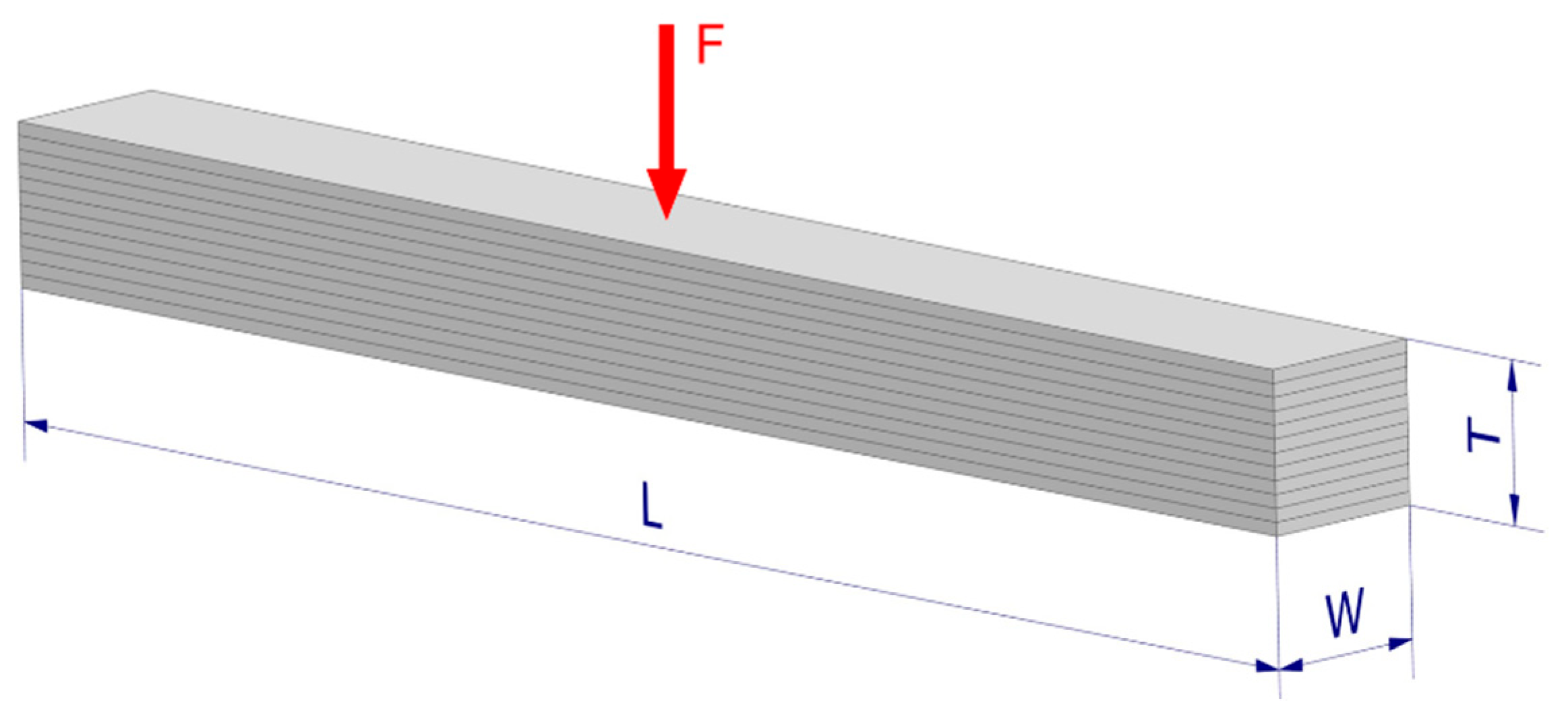 Figure 1. The length (L) was defined as the longest side of the sample. The width (W) was taken as the dimension along the grain orientation, whereas the thickness (T) was the dimension of the transverse grain arrangement. An example of the sample arrangement during tests is presented in