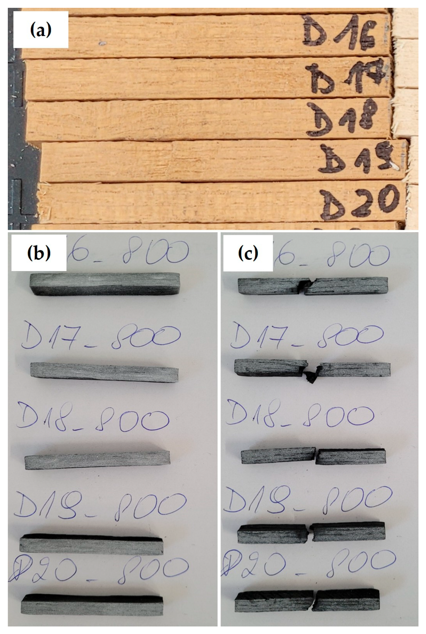The average length of all the samples prepared for the tests in a raw state was 79.98 ± 0.36 mm. In turn, in terms of the samples after the pyrolysis process, that dimension amounted to 66.26 ± 0.37 mm. Regarding the remaining dimensions of width and thickness, required for the tests, the raw samples had average values (width × thickness) of 10.37 ± 0.19 mm × 9.91 ± 0.22 mm. The samples shrunk after the pyrolysis process. The average values of width and thickness after pyrolysis were 7.89 ± 0.26 mm and 7.07 ± 0.27 mm, respectively. The samples before and after the carbonisation process were measured using a HELIOS PREISSER DIGI-MET 1320 417 electronic calliper (HELIOS-PREISSER, Gammertingen, Germany)—provided with a currently valid quality certificate. After determining the geometric dimensions of the samples in their raw state and following the carbonisation process, the mass of the samples was determined using a RADWAG laboratory scale (RADWAG, Radom, Poland). To determine the apparent (geometric) density of the samples before and after the pyrolysis process, Formula (2) was used.