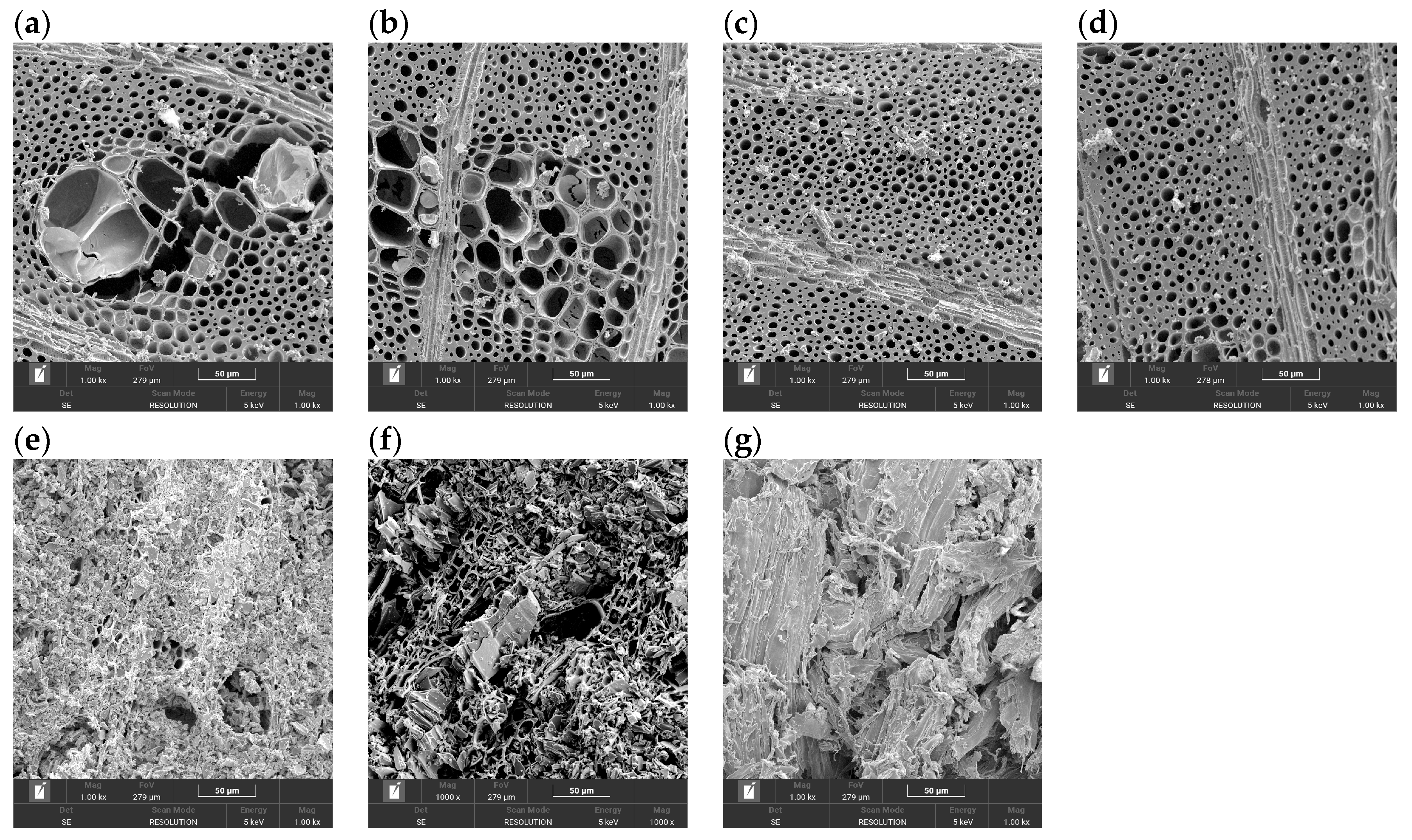 In the case of hornbeam, a full temperature series was analysed, including samples carbonised at 400 °C, 600 °C, 800 °C and 1000 °C, to follow the progressive changes in the cellular architecture. In addition, SEM images were acquired for fir, poplar and oak biochars after pyrolysis at 1000 °C in order to compare the microstructure of softwood (fir, poplar) and hardwood (oak, hornbeam) species under identical, high-temperature carbonisation conditions.