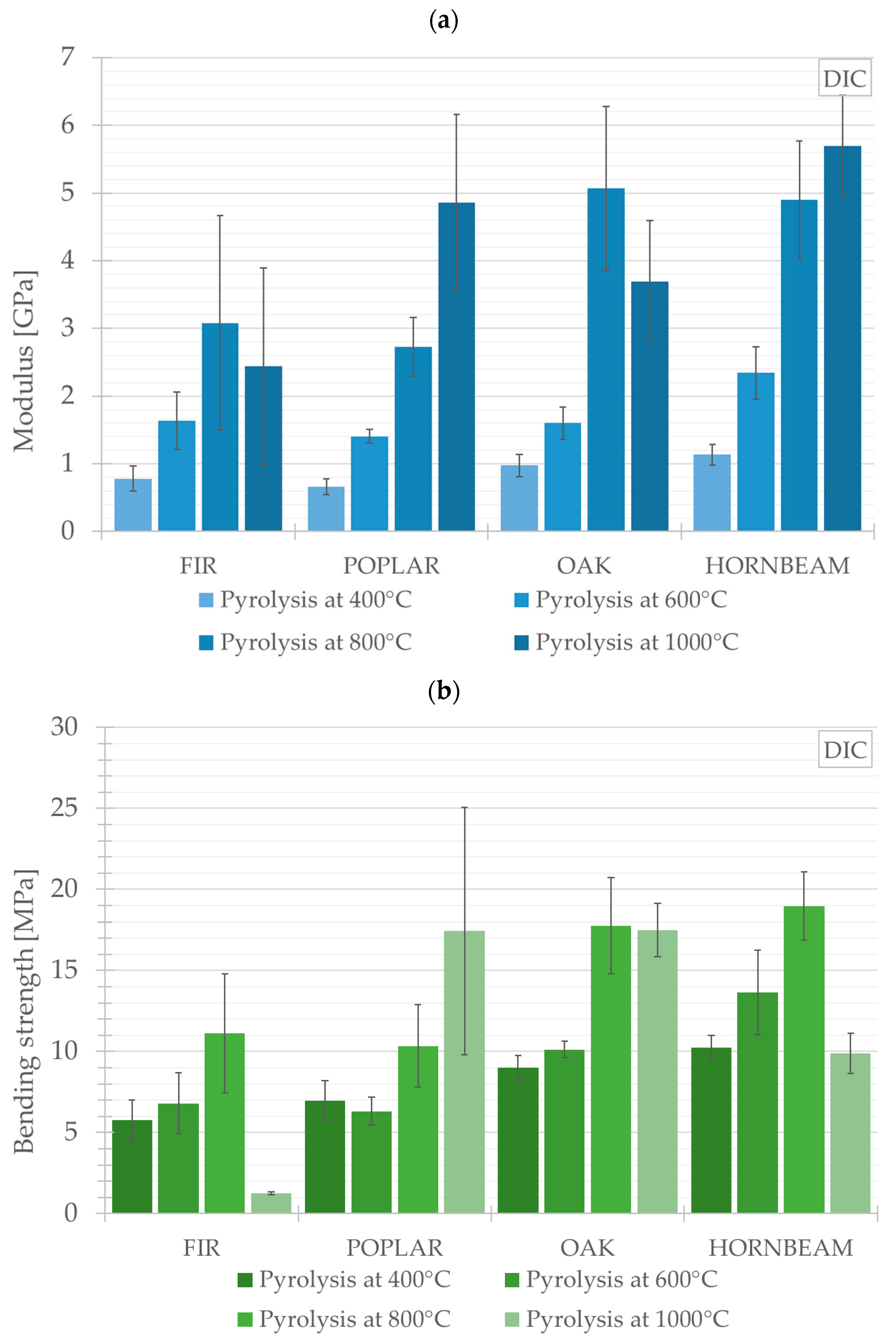 This chapter presents the results of three-point bending tests obtained using the DIC system for all experimental variants—both the raw samples and those subjected to pyrolysis at temperatures ranging from 400 °C to 1000 °C. The values compared are the average values for each tested group and each species (FIR, POPLAR, OAK, HORNBEAM). The key calculated mechanical properties and parameters obtained from the three-point bending tests for the wood species under investigation are presented along with an assessment of the effect of the pyrolysis process on their changes. The changes are illustrated graphically in