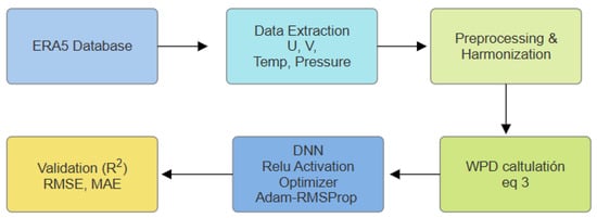 General workflow for WPD estimation from ERA5/ERA5-Land reanalysis data. The process includes data extraction, harmonization, wind-vector computation, vertical adjustment to 100 m, WPD calculation, and preparation of standardized datasets for neural-network training (Appendix B).