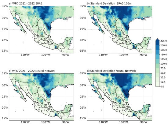 Despite this progress, nationwide wind assessments in Mexico remain constrained by limited observational coverage and high computational costs. Traditional mesoscale numerical simulations (e.g., WRF, RegCM4) provide valuable detail but require extensive calibration and specialized infrastructure, restricting their applicability for rapid or large-scale evaluations [6]. This limitation underscores the need for data-driven alternatives capable of efficiently producing consistent national-scale WPD estimations. However, the dense neural network (DNN) developed in this study is not intended to replace physics-based models such as WRF nor to reproduce their atmospheric dynamics. Instead, it serves as a computationally efficient surrogate trained to emulate the statistical patterns present in the ERA5 reanalysis. In this study, ‘efficiency’ refers strictly to computational cost and scalability: the DNN can generate national-scale WPD fields within seconds and produce projections up to two years ahead, while maintaining statistical similarity to ERA5. Accordingly, the comparison with numerical models concerns processing time and accessibility rather than physical fidelity, and the DNN inherits the intrinsic uncertainty of the ERA5 benchmark without improving observational accuracy.